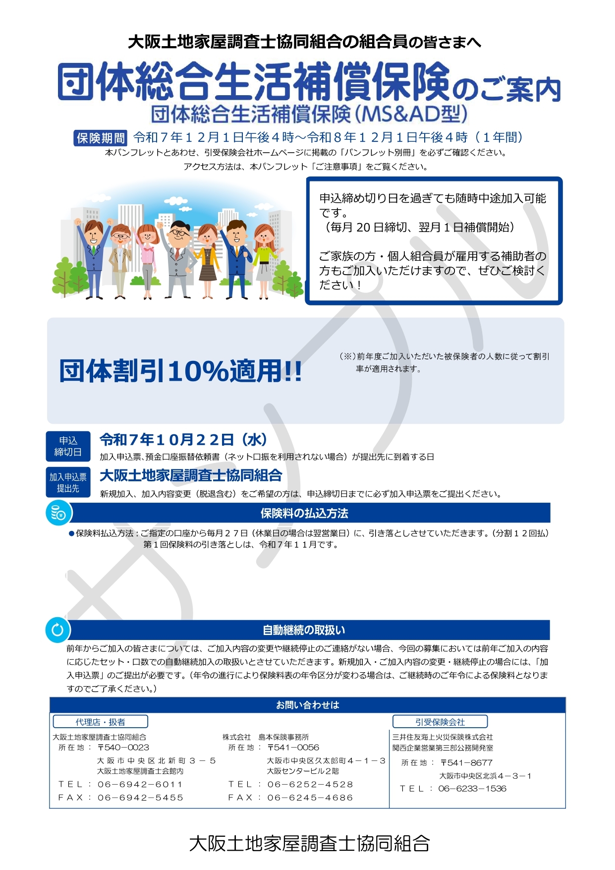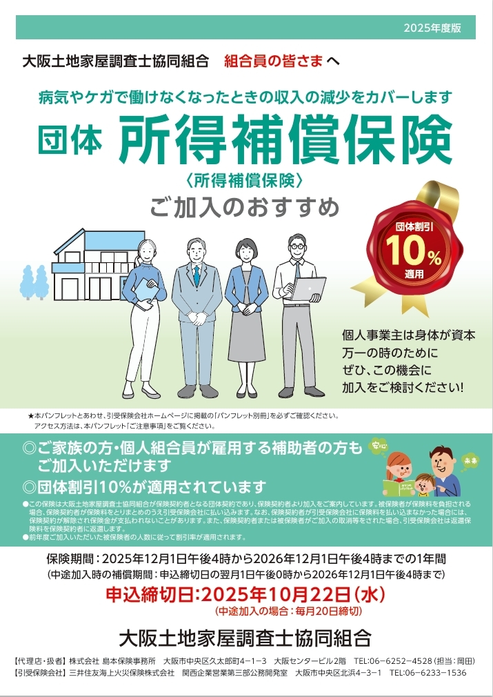 大阪土地家屋調査士協同組合では、「団体所得補償保険・団体傷害保険」を福利厚生制度として運営しております。